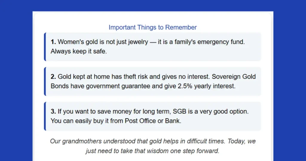 • पहली बात: स्त्री धन सिर्फ गहना नहीं है — यह परिवार का Emergency Fund है। इसे हमेशा संभालकर रखें।